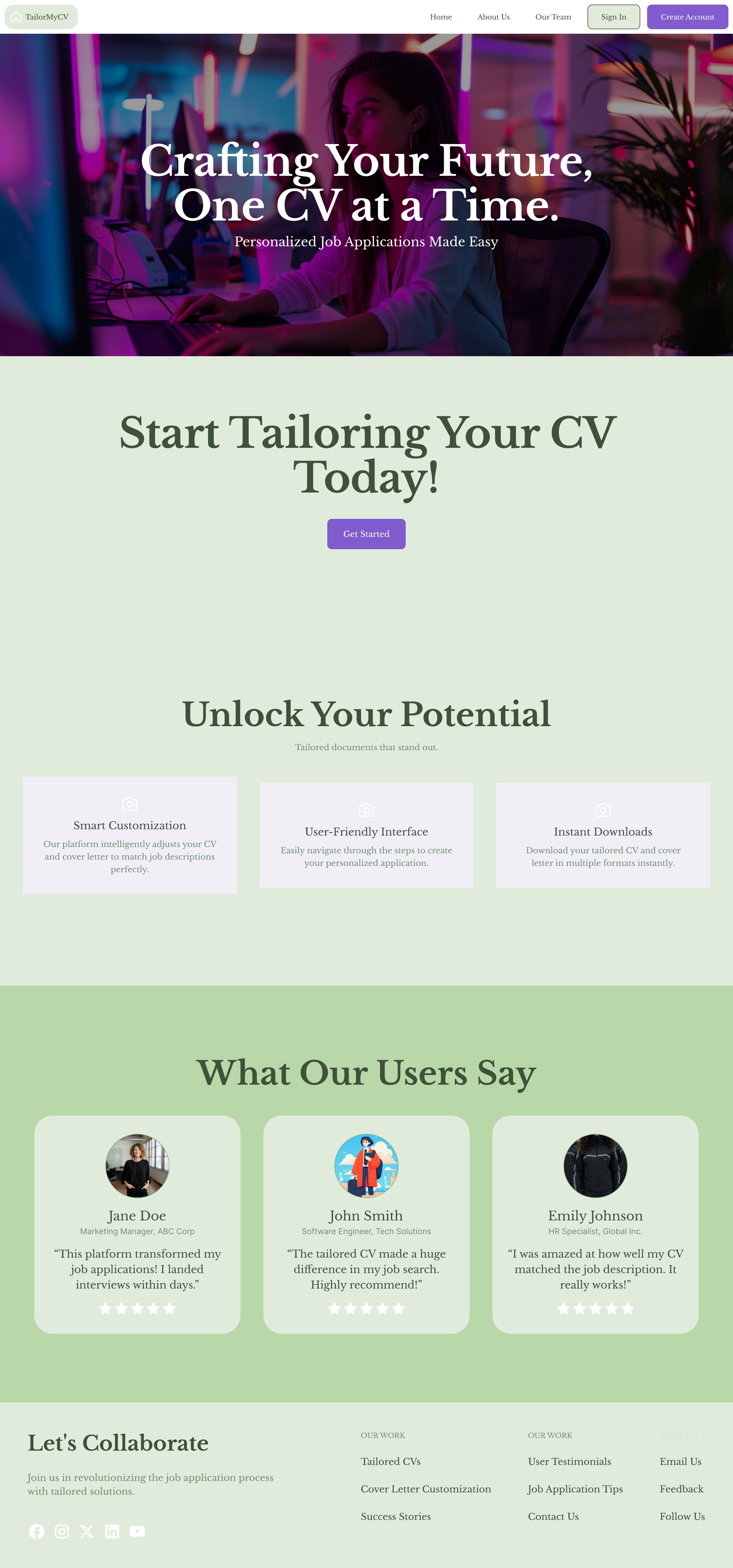 Prompt: Sure! Here's a list of screens for a web UI design for the platform that tailors CVs and cover letters based on the job description: Landing Page: An introductory screen explaining the purpose of the platform with a call to action to get started. Sign-Up Screen: For new users to create an account. Login Screen: For returning users to sign in. Profile Details Upload Screen: Where users can upload their existing CV or input their profile details. Job Description Input Screen: Where users can input or paste the job description they want their CV and cover letter tailored for. Generated CV & Cover Letter Screen: Displays the tailored CV and cover letter and provides options to download in PDF/DOC format. Body: What role are you planning to apply for? Share the job title and paste the full job description below, so we can customize your profile to match it perfectly. Input Section: Job Title: (Input field) Job Description: (Text box for pasting the description) Button: Continue ➔